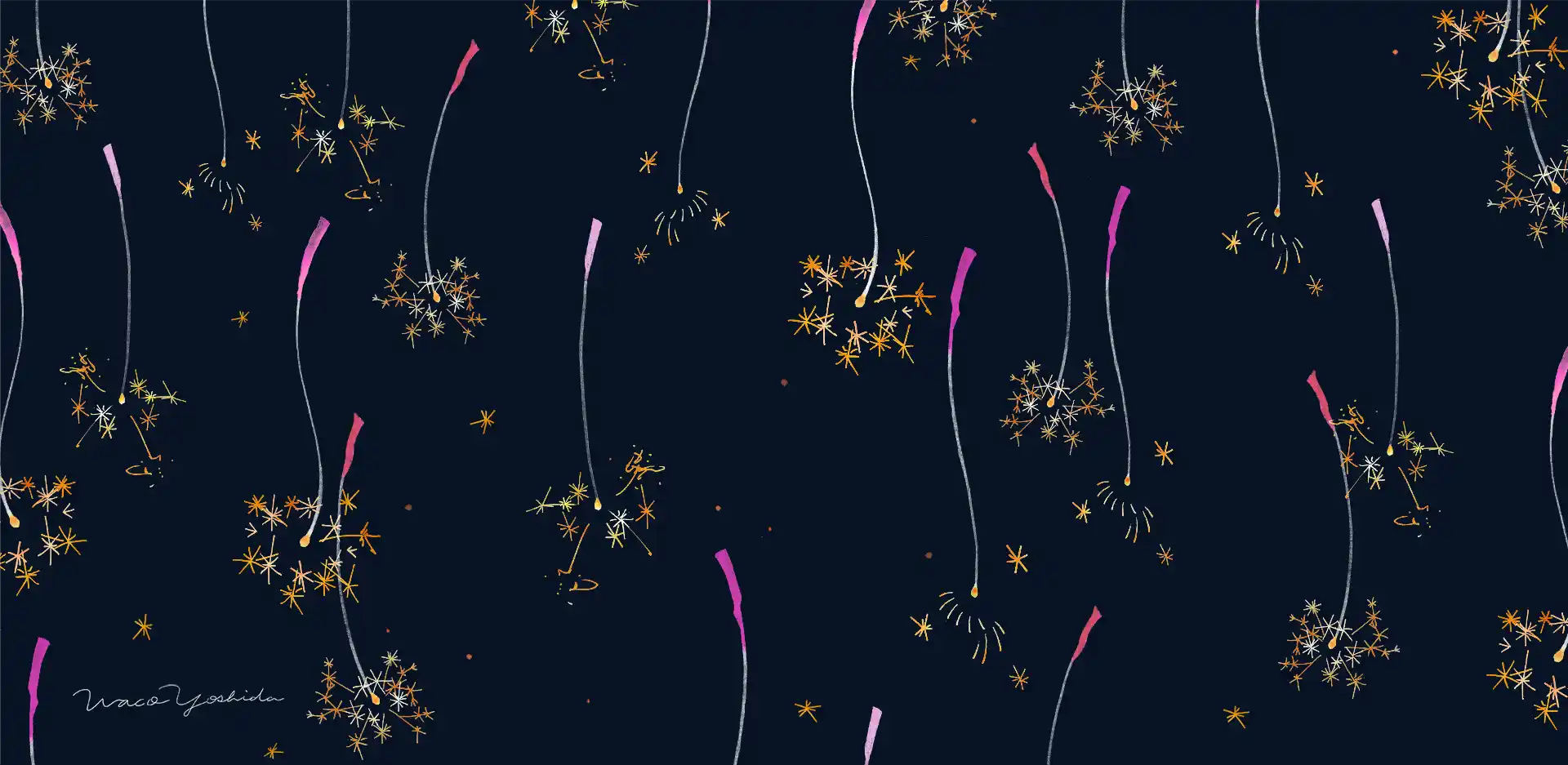 Date 2023 Category Private works Location 線香花火 Tags FireworksPatternSummer 線香花火 暑中お見舞い用に描いた、線香花火のパターンです。とろけ落ちるような花火の様子を描きました。
